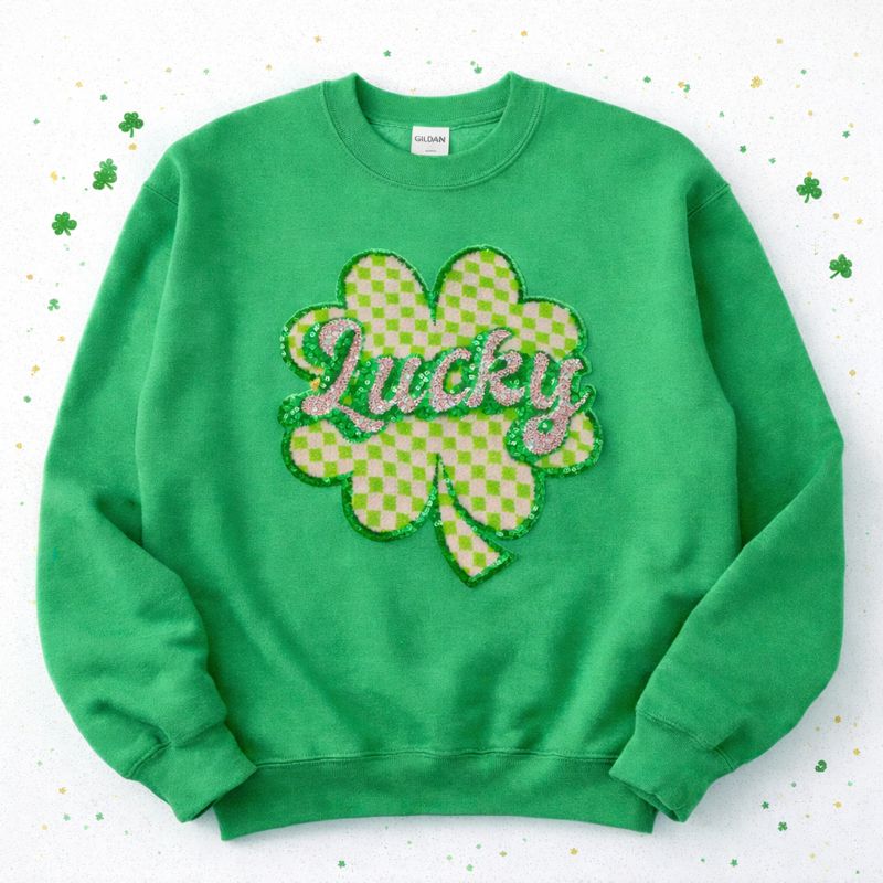 Lucky Checkered Clover St Patricks Day Sequin Chenille Patch Sweatshirt