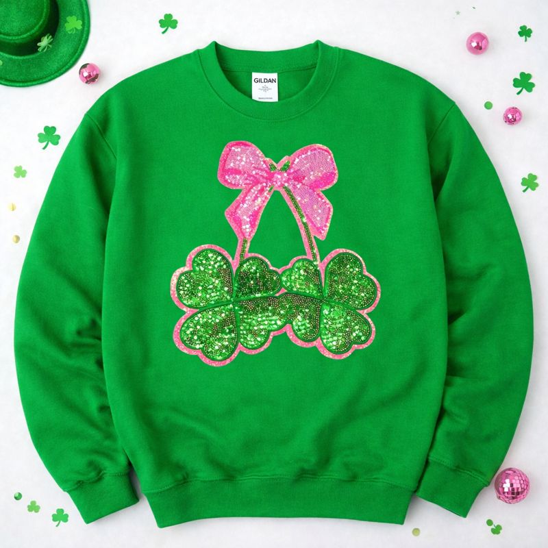 Pink Clover Bow St Patricks Day Sequins Patch Sweatshirt