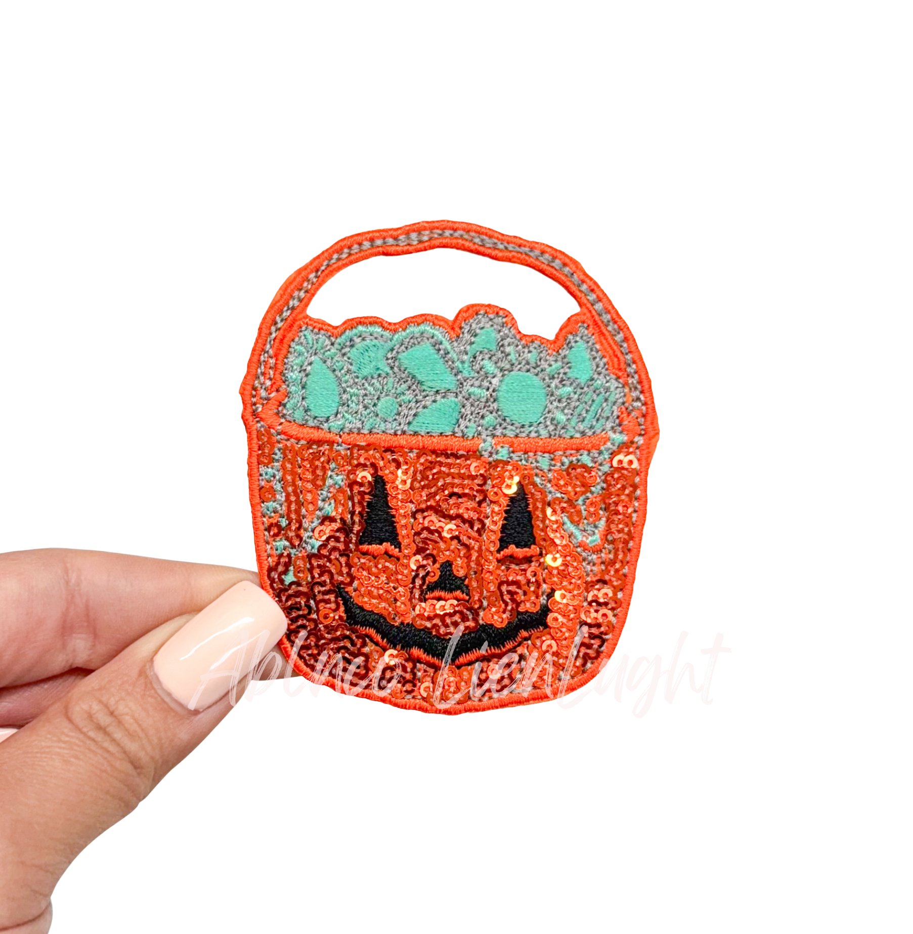 Turquoise Pumpkin Pail Halloween Sequin Patch